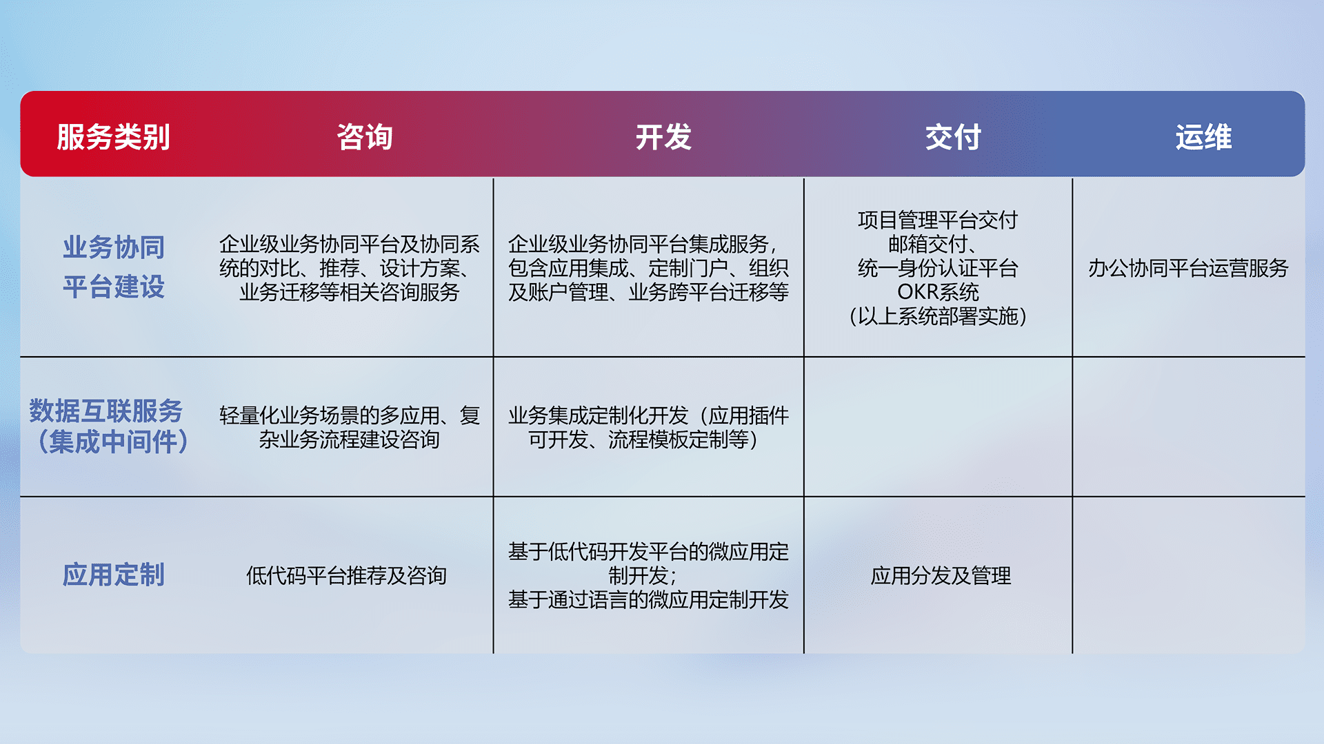 针对钉钉、、企微、、IDaas等平台级产品提供产品的规划、、、、方案、、交付、、定制化开发等服务,,,实现如统一协同办公、、智能客户服务、、、、混合会议管理、、、智能数据查询、、、、等业务场景,,,实现数字化转型。。。。